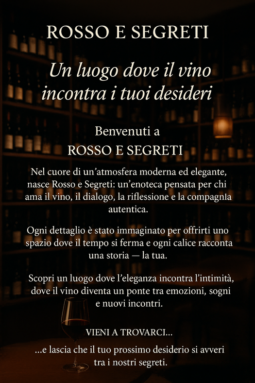 Rosso e Segreti è più di un’enoteca, è un rifugio accogliente dove il vino incontra le emozioni. Qui non vendiamo solo vini da abbinamento, ma offriamo un luogo dove fermarsi, ascoltarsi e portare a casa un ricordo, non solo una bottiglia.